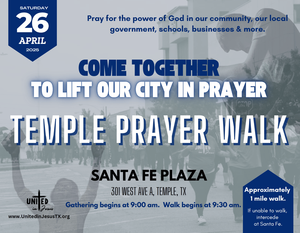 On April 26th, the city of Temple, Texas, will witness a heartfelt prayer walk organized by the local ministry, United in Jesus. This Prayer Walk invites residents and visitors alike to come together, lifting their voices in prayer for one another and for the community. Participants will walk through the heart of the city praying and lifting the name of the Lord Jesus on high. Such events not only enrich the community's spiritual life but also creates impactful changes and deepen the bonds between neighbors. A city set on top of a hill cannot be hid, so join this gathering April 26th at 9am. Starting address: 301 w ave A Temple Tx 76501 (the walk is approximately 1 mile)